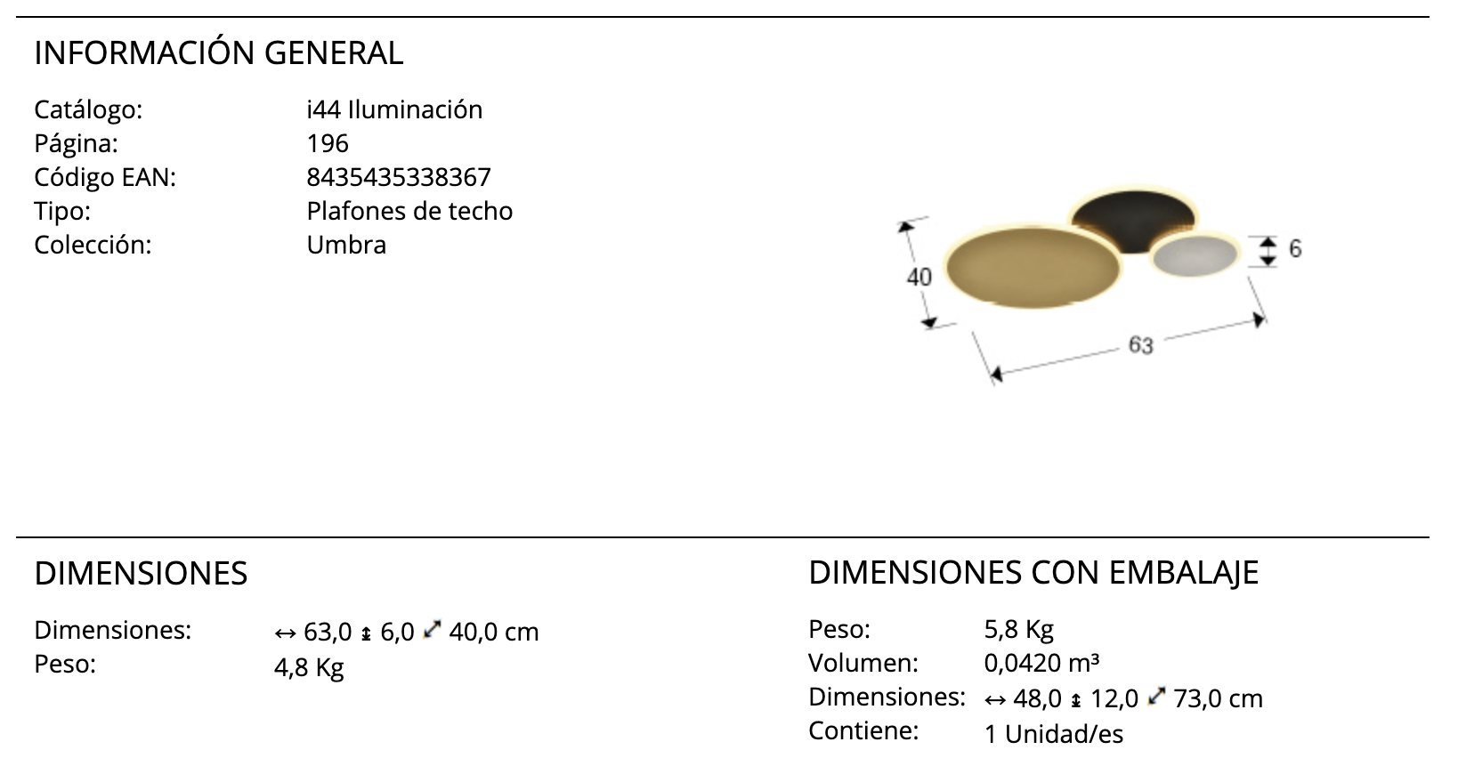 Plafón de techo, realizado en metal y aluminio, acabado en dorado, blanco y negro mate. Difusor de acrílico opal. 32W, 1.900lm, 3.000K. DIMABLE.
